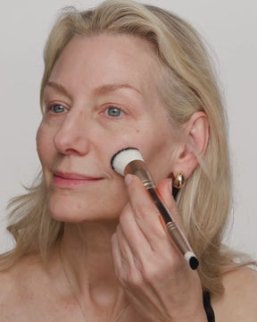 Voor het beste resultaat is de foundation ideaal aan te brengen met een kwast. Het zorgt ervoor dat de pigmentkorrels dieper tot de huid doordringen en zo voorkom je een witte was.